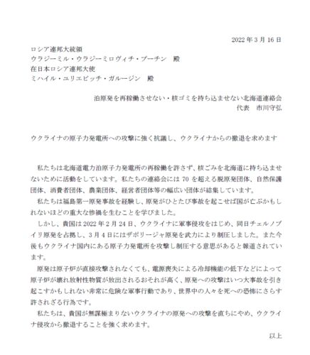道内の市民運動グループを束ねる連絡会が、今朝、ロシアに対する抗議文をロシア大使館と在札幌総領事館(こちらはプーチン大統領と総領事宛)に送付しました。