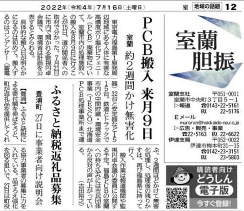 室蘭市への放射性高濃度PCB廃棄物の処理事業について 7月16日、17日、道新胆振版 室蘭PCB問題をめぐる記事が掲載されました。 1.8/9に搬入予定と報じられました。 しかし、監視円卓会議の委員の一人は、これはまだ正式なもの ではないと言っています。 21…