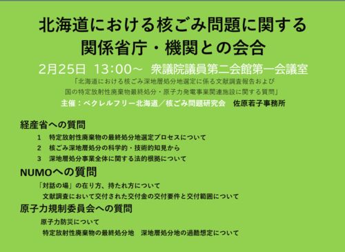 全国の原子力施設に反対する皆様へ 突然ですが、急遽、北海道の仲間とともに国会衆議院会館へ向かい、 経産省、NUMO、原子力規制委員会に対して、質問書に対して回答していただくため (※会場・オンラインのハイブリッド開催) 「北海道における核資源問題に…