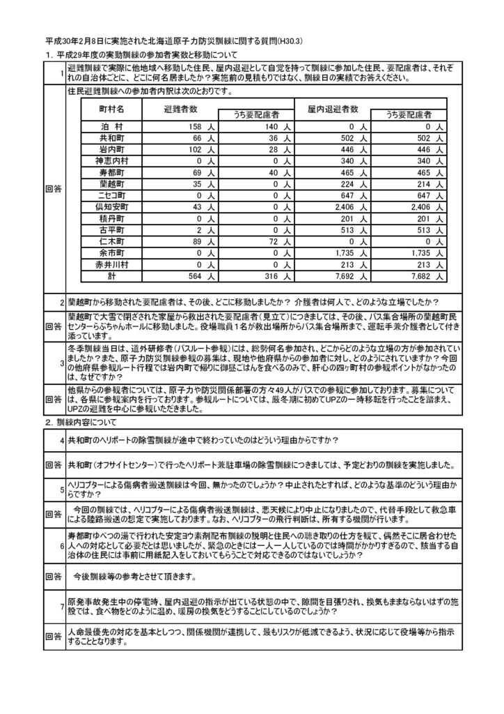 本年、平成30年2月8日に実施された泊原発周辺地域防災訓練に参観し、気が付いたことなどを、原子力防災担当部署課に質問していました。