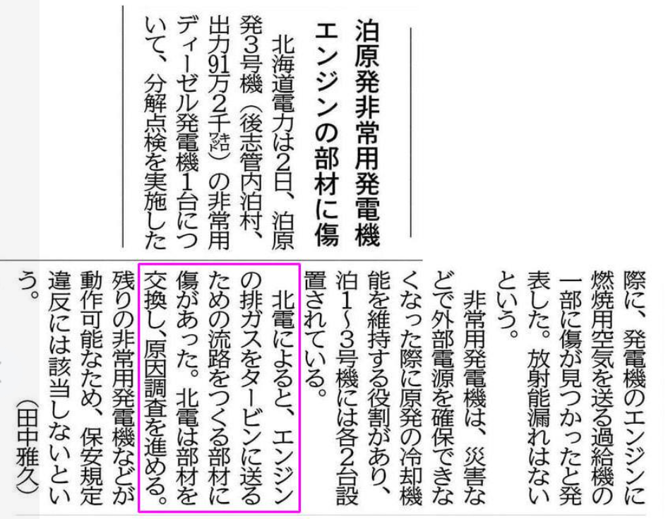 北電によると、エンジンの排ガスをタービンに送るための流路をつくる部材に傷があった。北電は部材を交換し、原因調査を進める。残りの非常用発電機などが動作可能なため、保安規定違反には該当しないという。(北海道新聞/田中雅久)3月2日