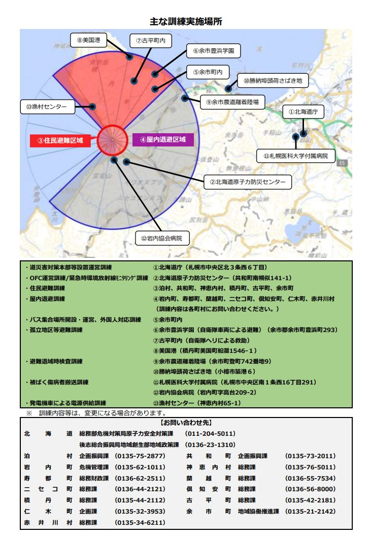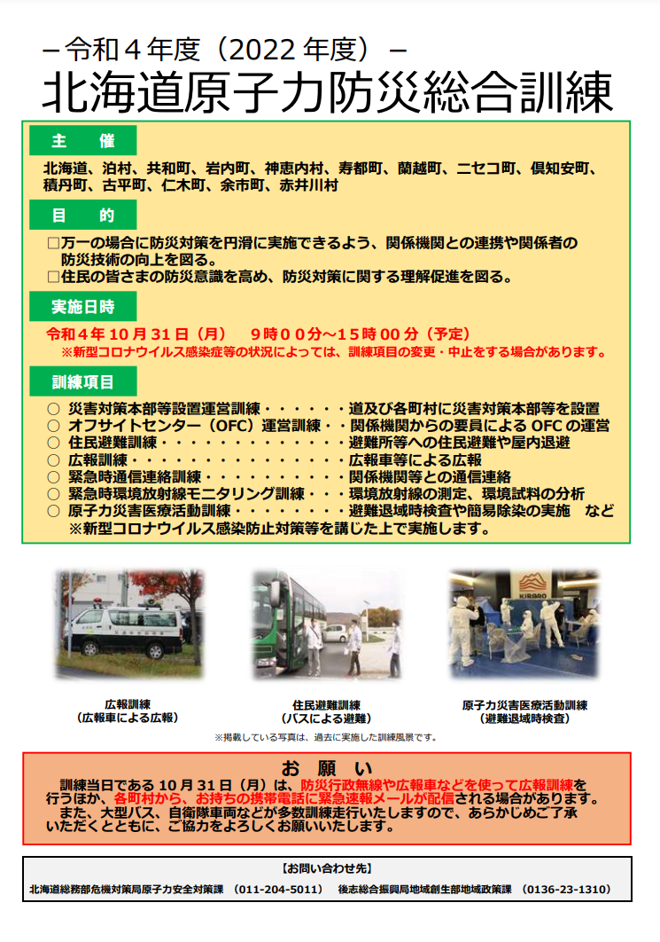この度、北海道と関係町村(泊村、共和町、岩内町、神恵内村、寿都町、蘭越町、ニセコ町、倶知安町、積丹町、古平町、仁木町、余市町、赤井川村)では、北海道電力(株)泊発電所における原子力災害に備え、令和4年10月31日(月)に、原子力防災総合訓練を実施します。