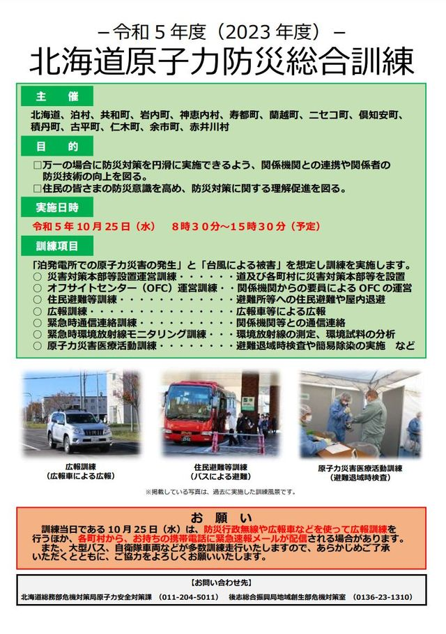 2023-10-17 令和5年10月25日北海道原子力防災避難訓練 https://www.pref.hokkaido.lg.jp/.../02_%E6%B5%B7%E9%81%93... 令和5年度(2023年度)北海道原子力防災総合訓練実施要綱 (PDF 1.17MB) https://www.pref.hokkaido.lg.jp/fs/9/2/5/5/7/1/6/_/03_%E5%8E%9F%E5%AD%90%E5%8A%9B%E7%81%BD%E5%AE%B3%E3%81%AB%E5%82%99%E3%81%88%E3%81%9F%E5%B1%8B%E5%86%85%E9%80%80%E9%81%BF%E3%83%9E%E3%83%8B%E3%83%A5%E3%82%A2%E3%83%AB.pdf 屋内退避マニュアル
