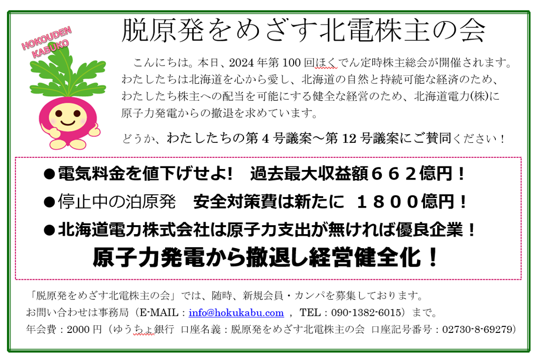 「第100回北海道電力定時株主総会報告」を脱原発をめざす北電株主の会