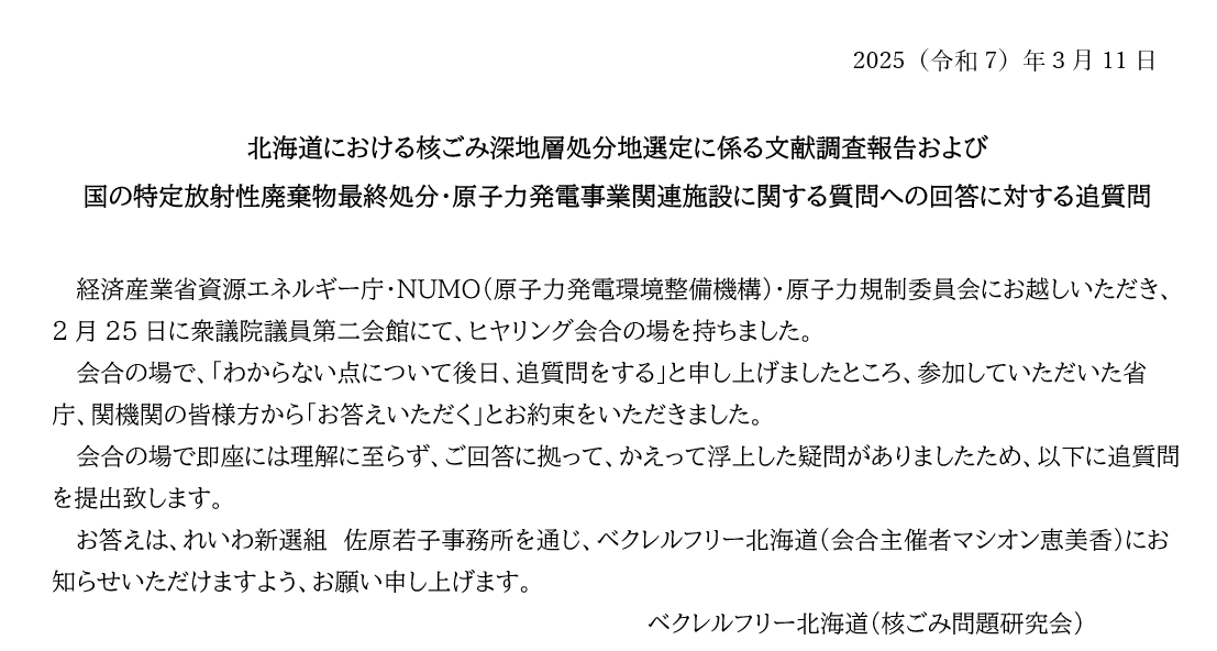 経済産業省資源エネルギー庁・NUMO(原子力発電環境整備機構)・原子力規制委員会にお越しいただき、2月25日に衆議院議員第二会館にて、ヒヤリング会合の場を持ちました。会合の場で、「わからない点について後日、追質問をする」と申し上げましたところ、参加していただいた省庁、関機関の皆様方から「お答えいただく」とお約束をいただきました。会合の場で即座には理解に至らず、ご回答に拠って、かえって浮上した疑問がありましたため、以下に追質問を提出致します。